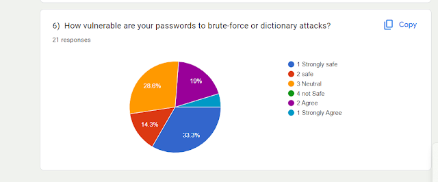 6)The chart shows how people think their passwords are safe from online attacks. About 33.3% of people find their password to be very secure, which indicates a high level of trust in its security. About 14.3% consider their password secure, suggesting they trust its protection. A larger group, approximately 26.6%, believe their password is somehow secure, implying a sense of uncertainty or awareness of potential vulnerabilities. A smaller percentage of respondents consider their password vulnerable to online attacks, indicating concern about its security.